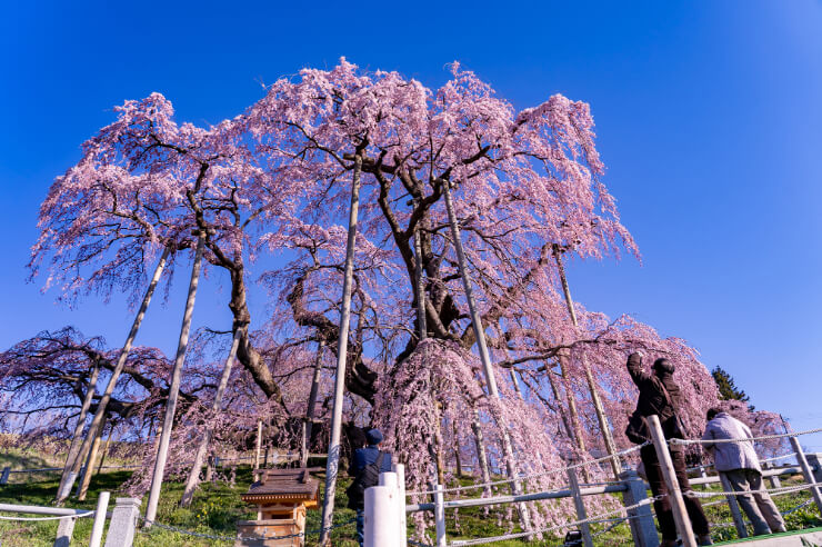 樹高12mの高さからピンク色の花が咲く枝が地上に向かって垂れ下がる様子は、まるで滝のようで、毎年30万人以上の見物客が訪れる、東北隋一のお花見スポットになっています。