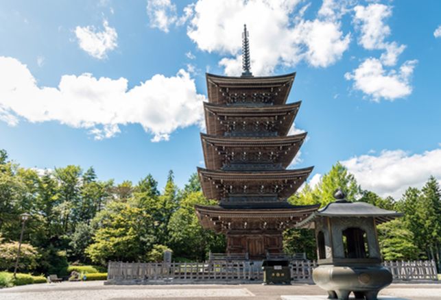 「五重塔」は四季折々の姿が見られ、秋には紅葉とのハーモニーが、冬には五重塔に積もった雪がとても綺麗です。