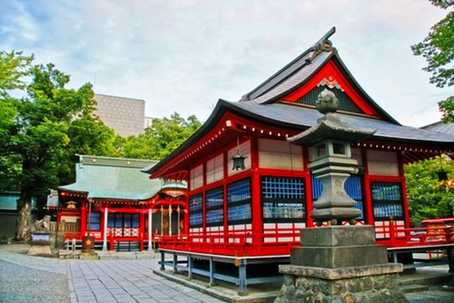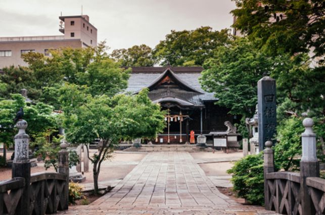 1872年に筑摩県松本に設置された神道中教院で、1874年に四柱の神(天之御中主神・高皇産霊神・神皇産霊神・天照大神)を祀ったと言われています。 1879年に現在地に社殿を創建されたと言われています。縄手通り沿いにある「大鳥居」は鉄製のダイナミックで迫力があります。社務所前にある「縁結びの松」は根元の部分が2つに伸びて繋がっているめずらしい松です。是非ご覧ください。