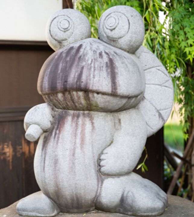 江戸時代は、総掘りと女鳥羽川に挟まれた土手だったそうで、一本の縄を伸ばしたような真っ直ぐな道から「縄手通り」と呼ばれていました。「カエル大明神」を祀っており、昔の女鳥羽川にはカエルがたくさん棲んでいましたが、鳴き声が聞こえなくなってしまい再びカエルが棲めるような綺麗な川にしたいという願いを込めているそうです。そば、たこ焼き、たい焼きなどの日本食、雑貨を売っているお店が並んでいます。