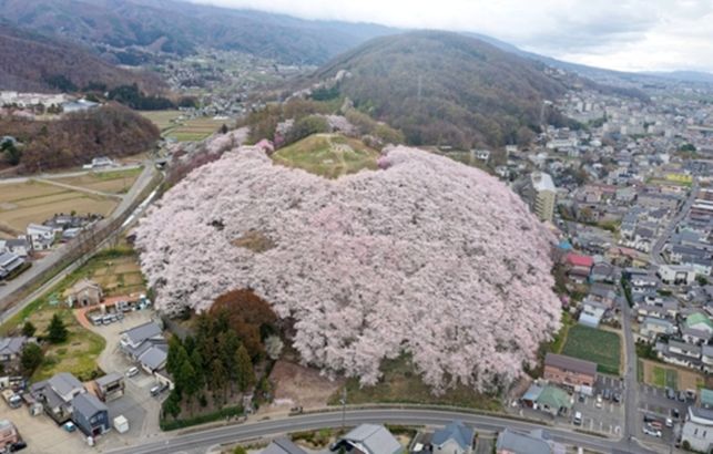 3世紀末の築造と推定される、全長66mの前方後方墳で、松本市を代表する古墳です。「弘法山古墳」の発掘調査は1974年に行われたそうです。春の「弘法山古墳桜まつり」東日本最古の前方後方墳の周りに、約4,000本の桜が咲きます。昼間は桜越しに北アルプスが綺麗で、夜はライトアップされた桜と松本市街地の夜景が幻想的です。古墳を桜が取り囲む姿は圧巻です。