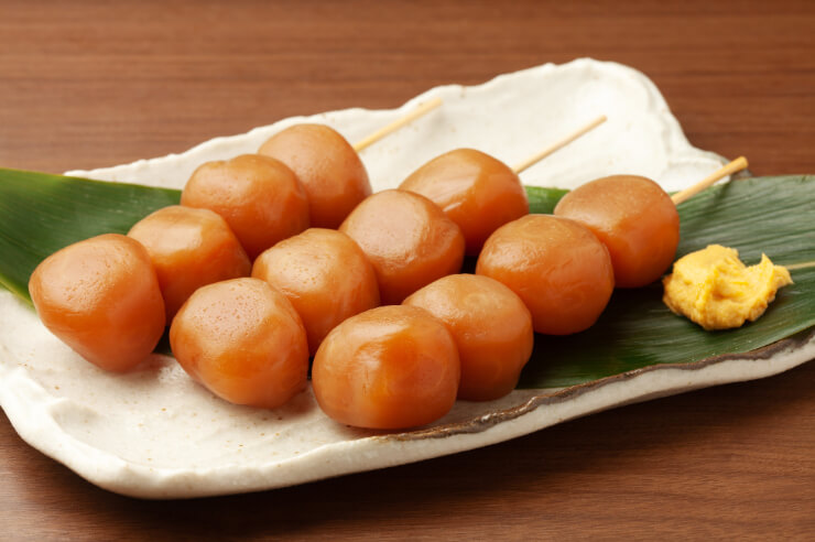 ・玉こんにゃく:山形の祭りやイベントに欠かせないのが、玉こんにゃく。醤油ベースのタレで煮込んだ熱々を、串に刺して食べます。